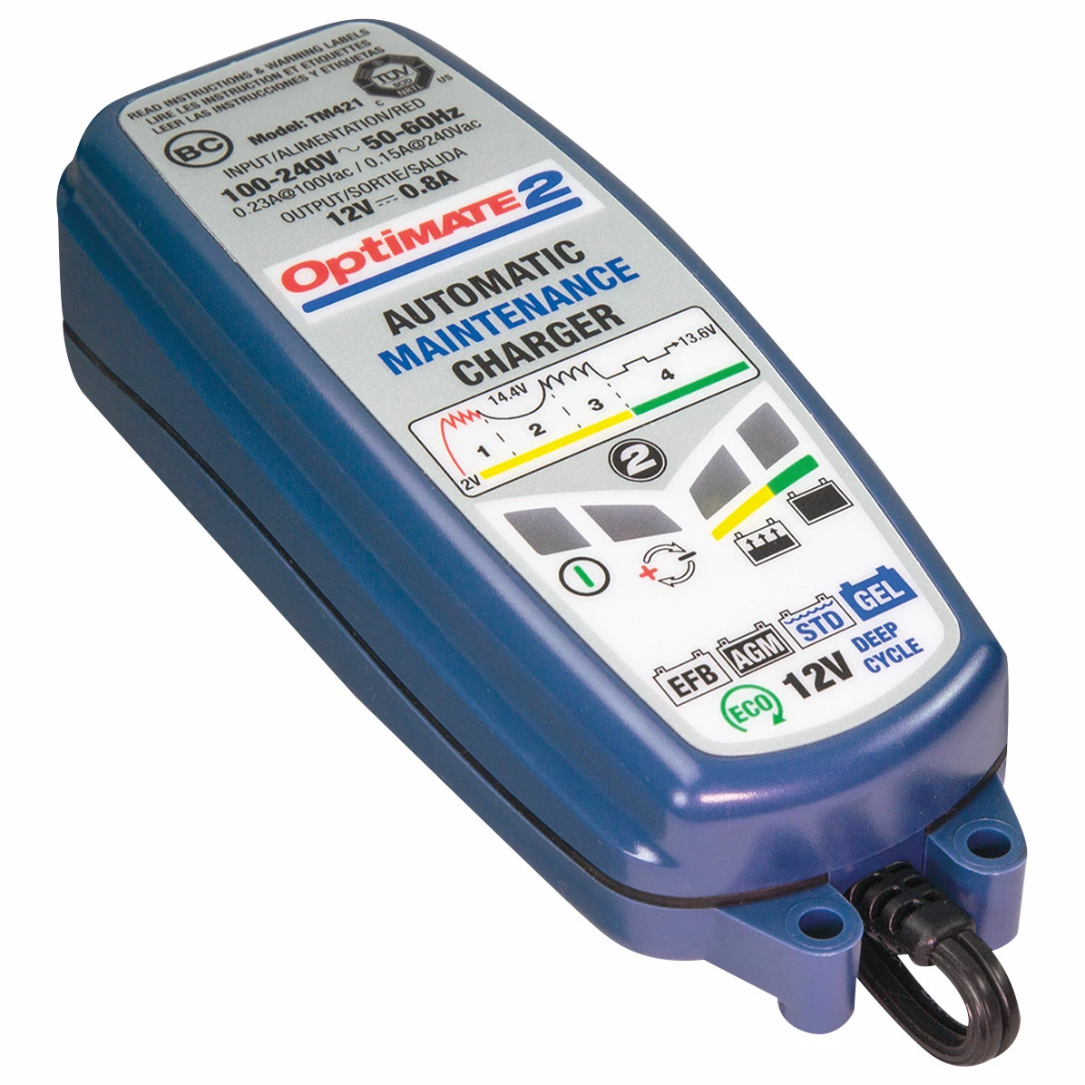 • With 0.8A constant current OptiMate 2 automatically brings the battery to full charge and then switches to the unique OptiMate battery-saving maintenance charge mode to keep the battery at 100% ready, and at the same time provides power to the on-board computer, display or antitheft alarm