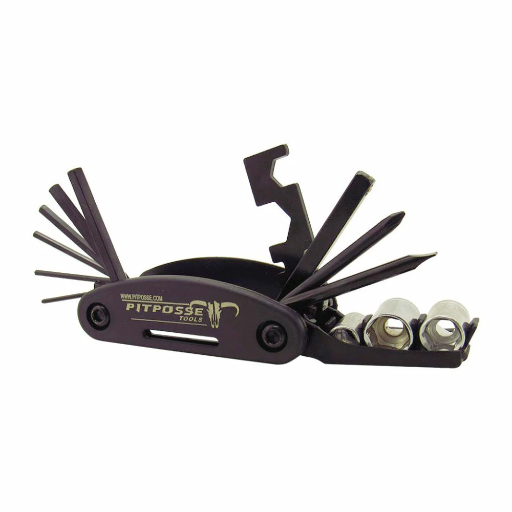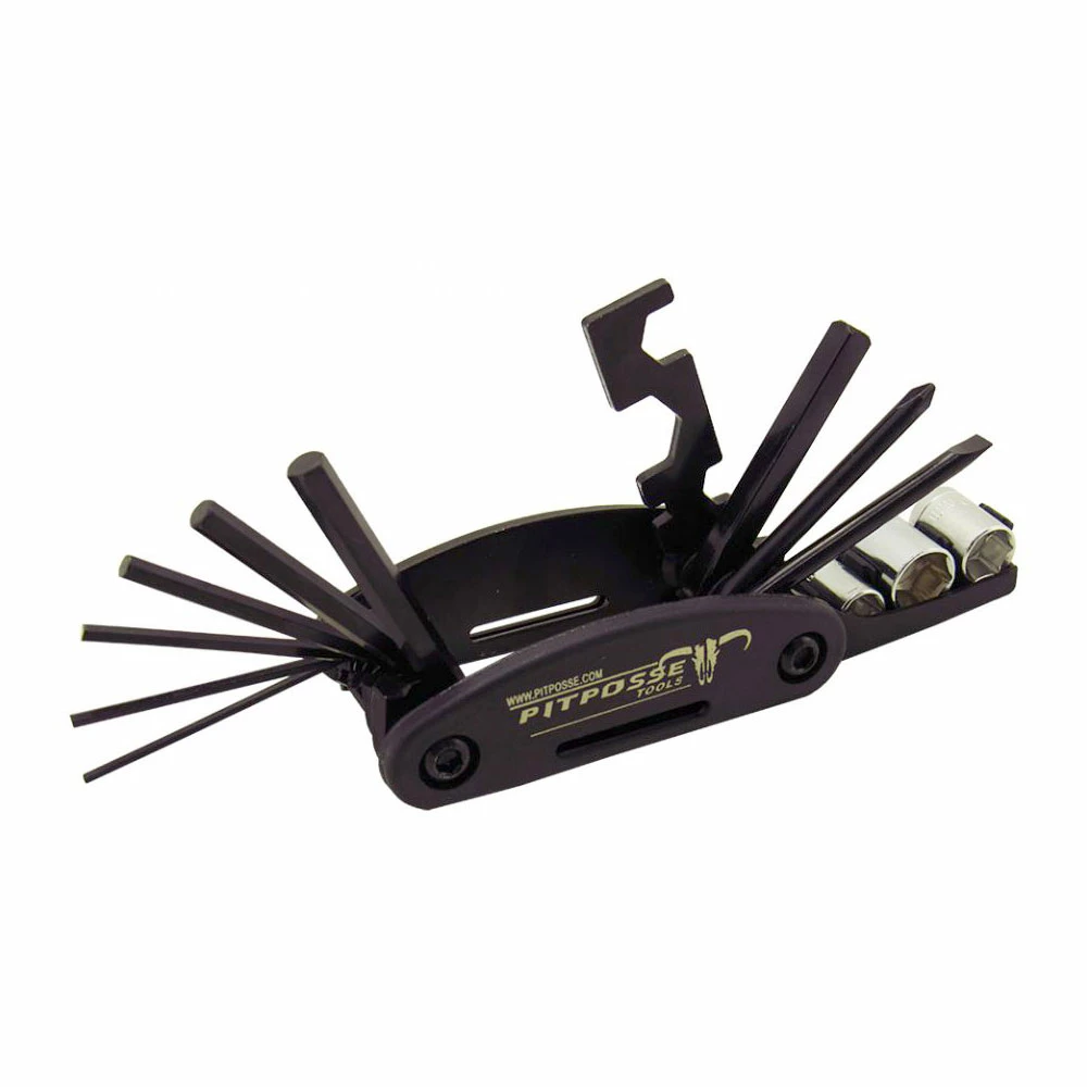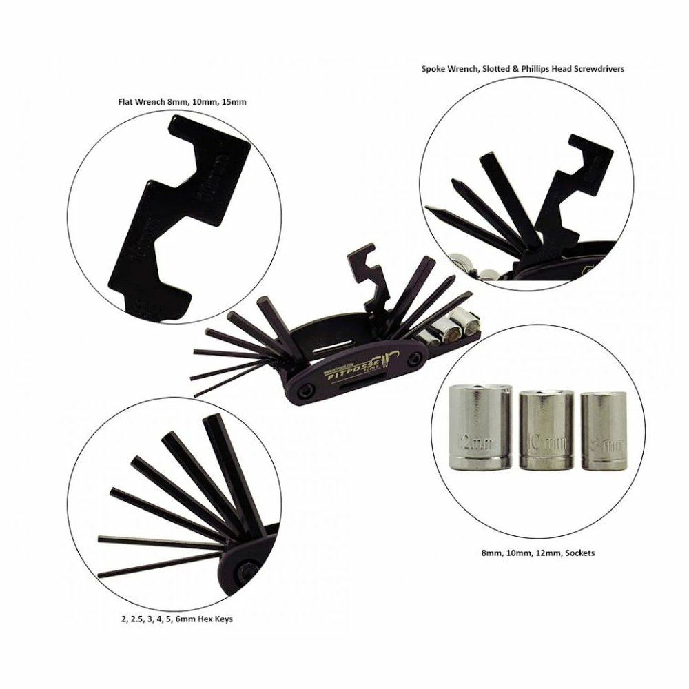• Includes 2, 2.5, 3, 4, 5, 6 hex keys- 8, 10, 15 open wrench- 1/4 inch driver with 8, 10, 12mm sockets- spoke wrench- Philips and standard screw driver