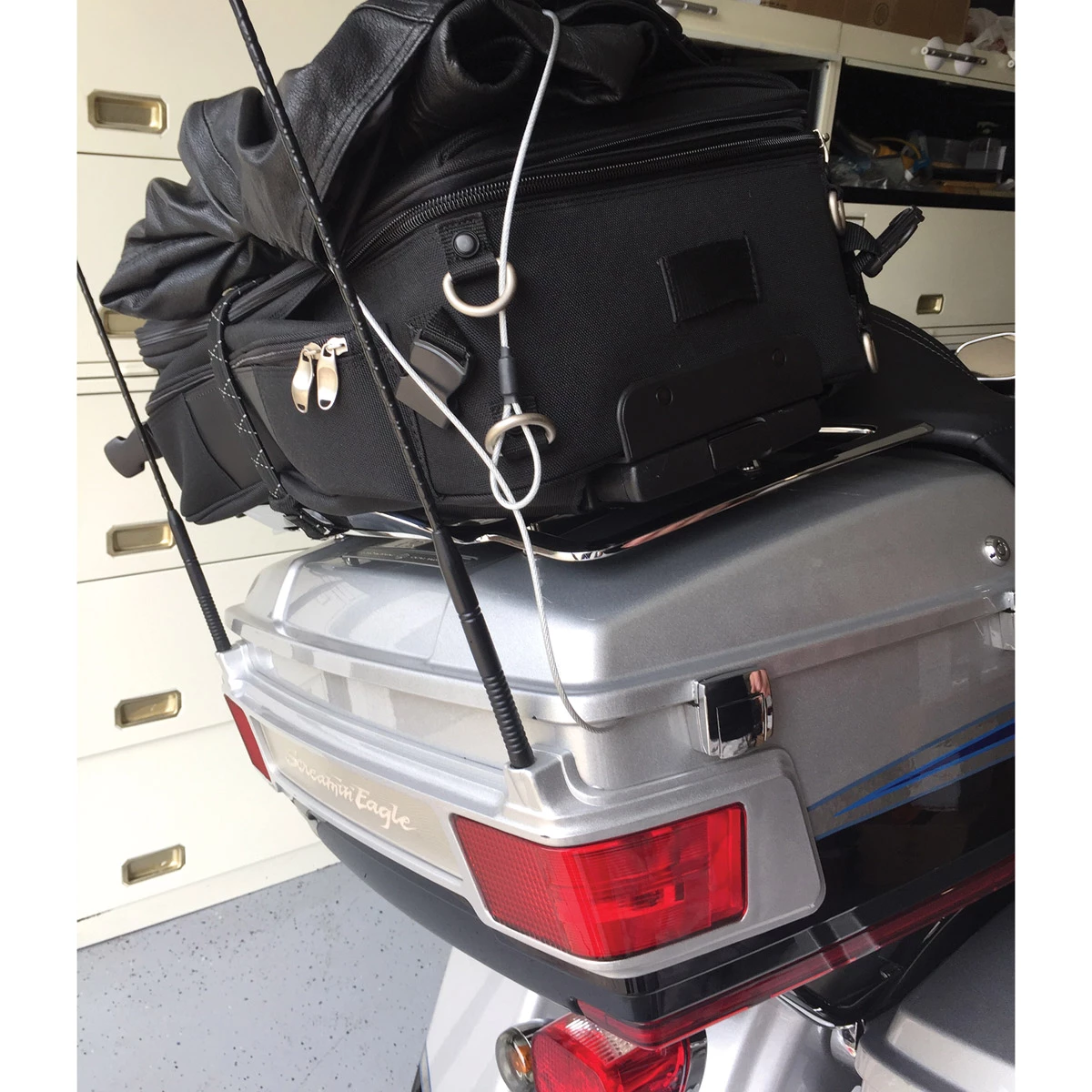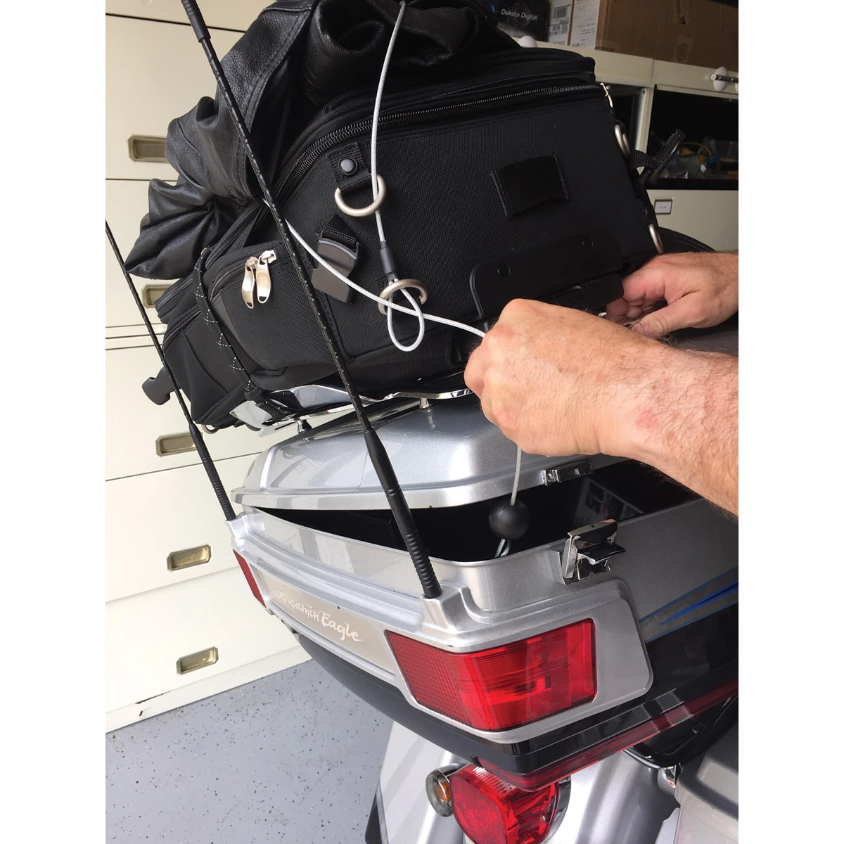 • Then place the black ball into a locking lid such as your tour pack or saddlebag, the ball is now trapped when you close and lock the lid.