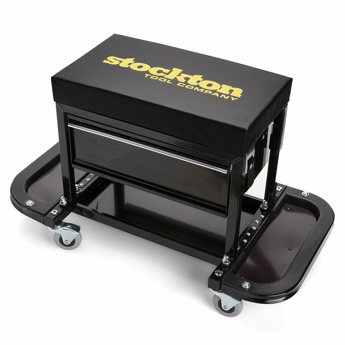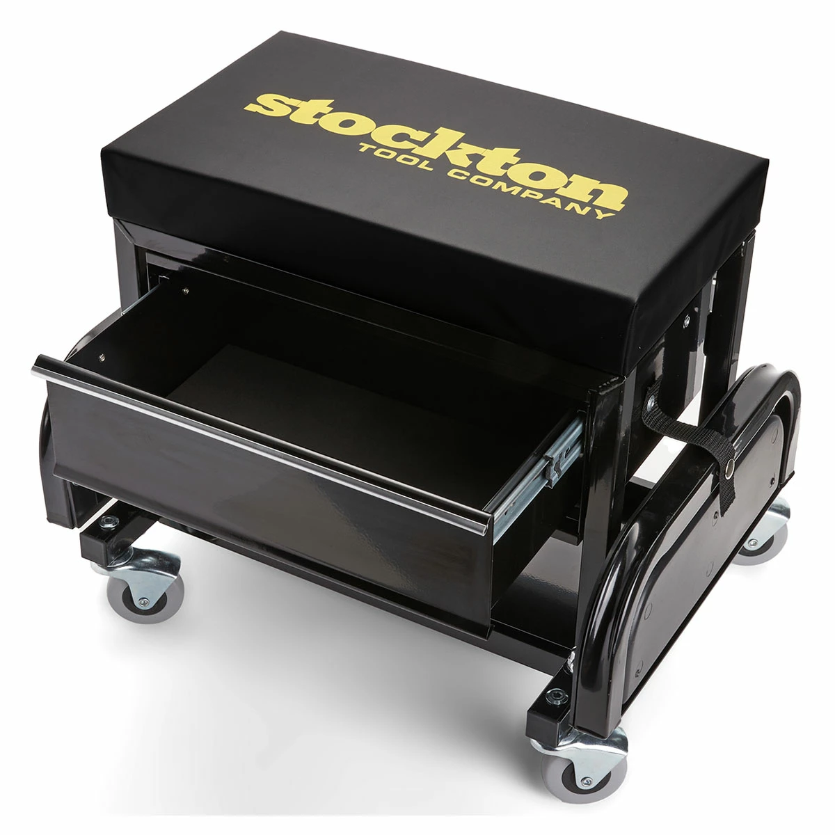 Keep those 10mm sockets right under your uhh, …within easy reach with the Stockton Tool Box Roller Seat. This smooth-gliding wheeled stool features a heavy-duty drawer, a broad shelf for larger tools and a set of recessed trays for keeping loose fasteners and sockets in one place.
